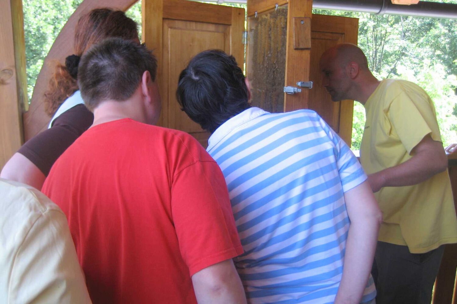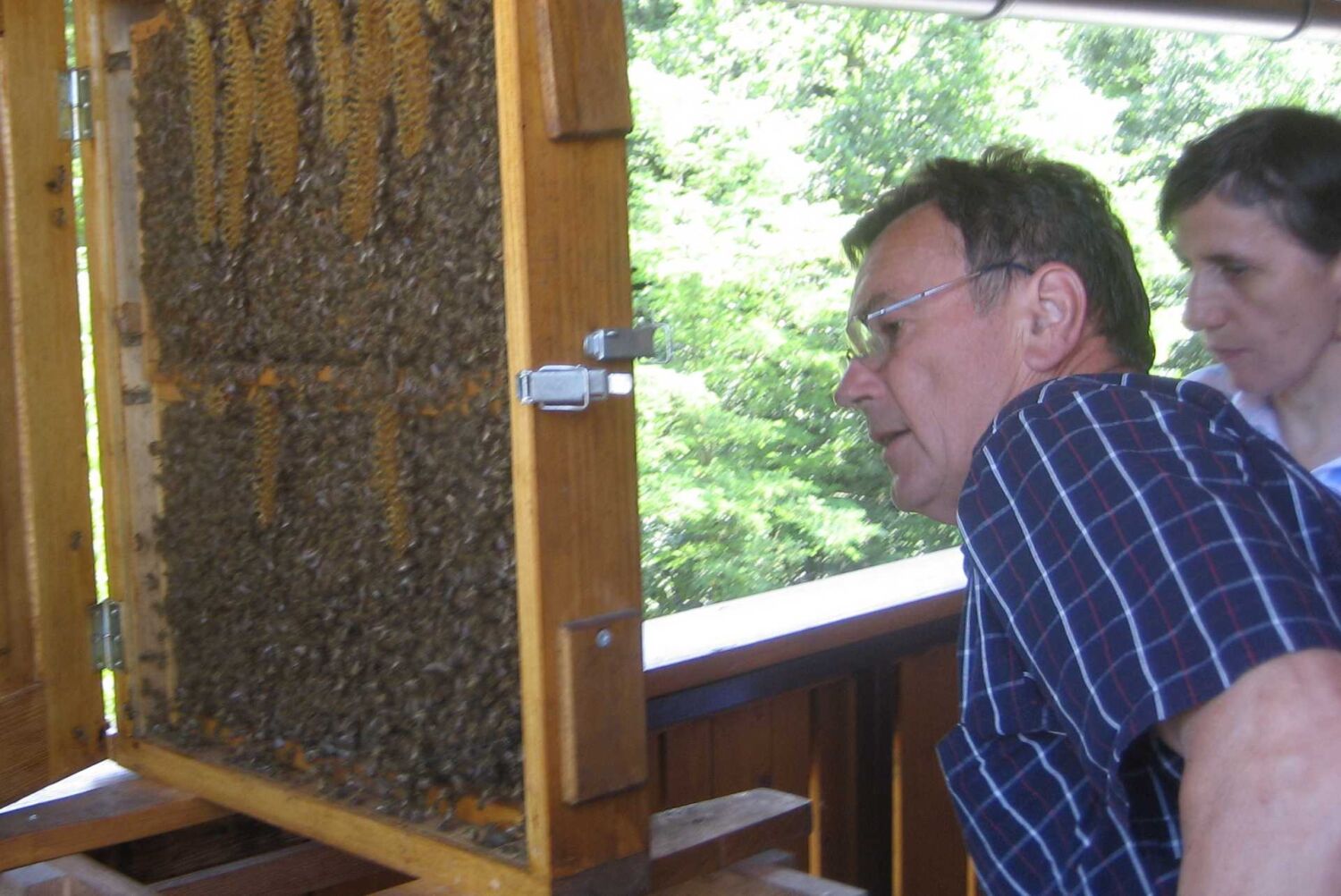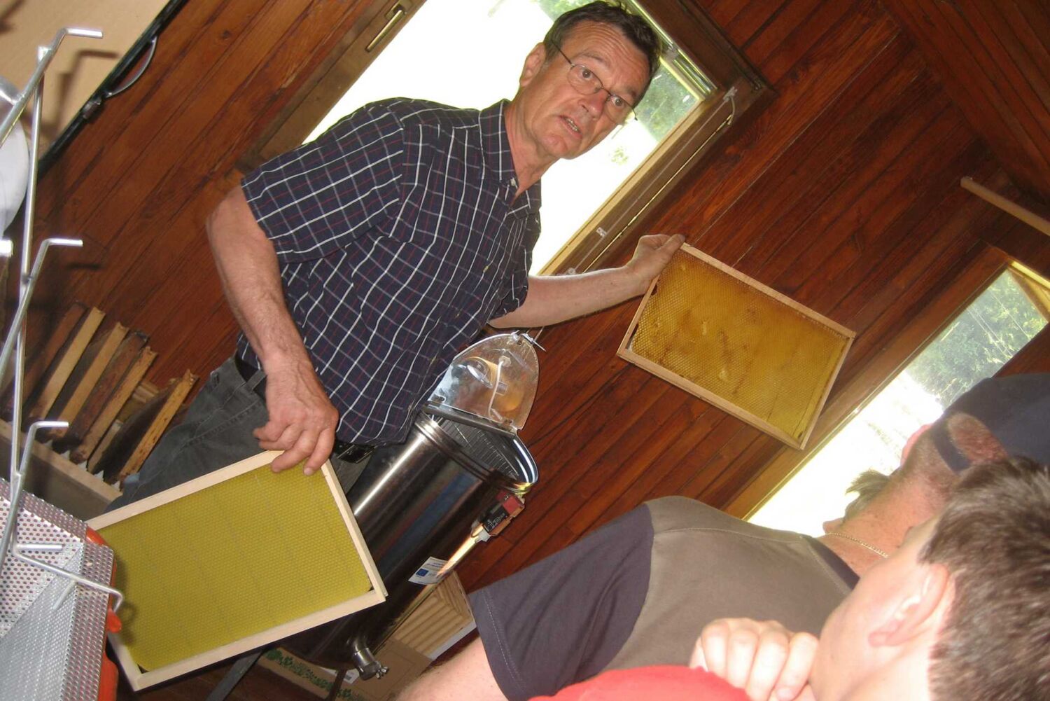 V Domu čebelarjev Čebelarskega društva Škofja Loka v Brodeh nas je sprejel gospod Rudi Bizovičar, ki ve veliko o čebelah iin čebelarstvu. Ogledali smo si panj in spoznali Kranjsko čebelo Sivko. Izvedeli smo, da je v enem panju tudi po 40.000 čebel, od tega 1.000 do 1.500 trotov in ena čebela matica. Gospod Bizovičar nam je predstavil tudi različne delovne pripomočke, ki jih čebelarji uporabljajo pri predelavi čebeljega medu in zaščitno obleko čebelarja.