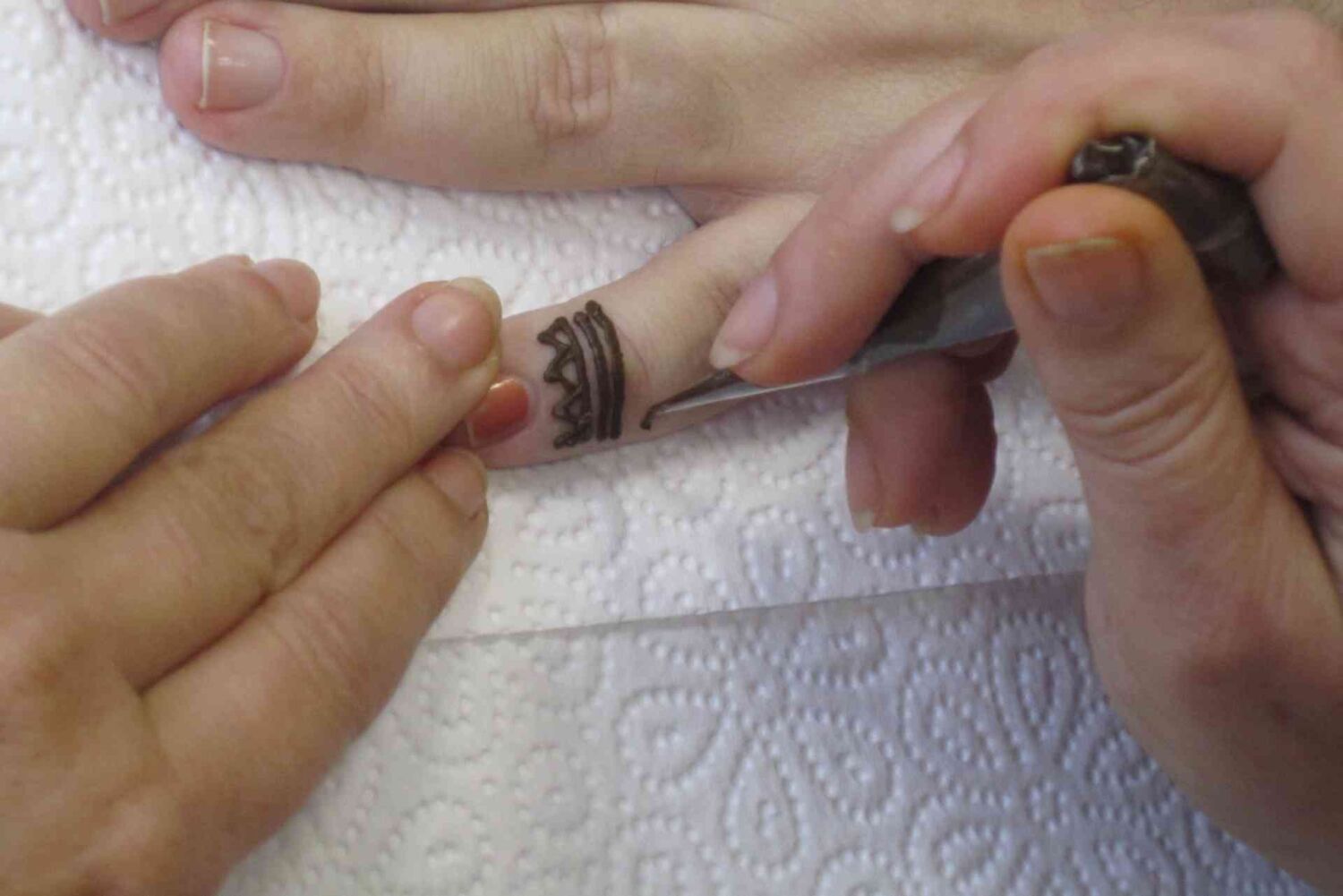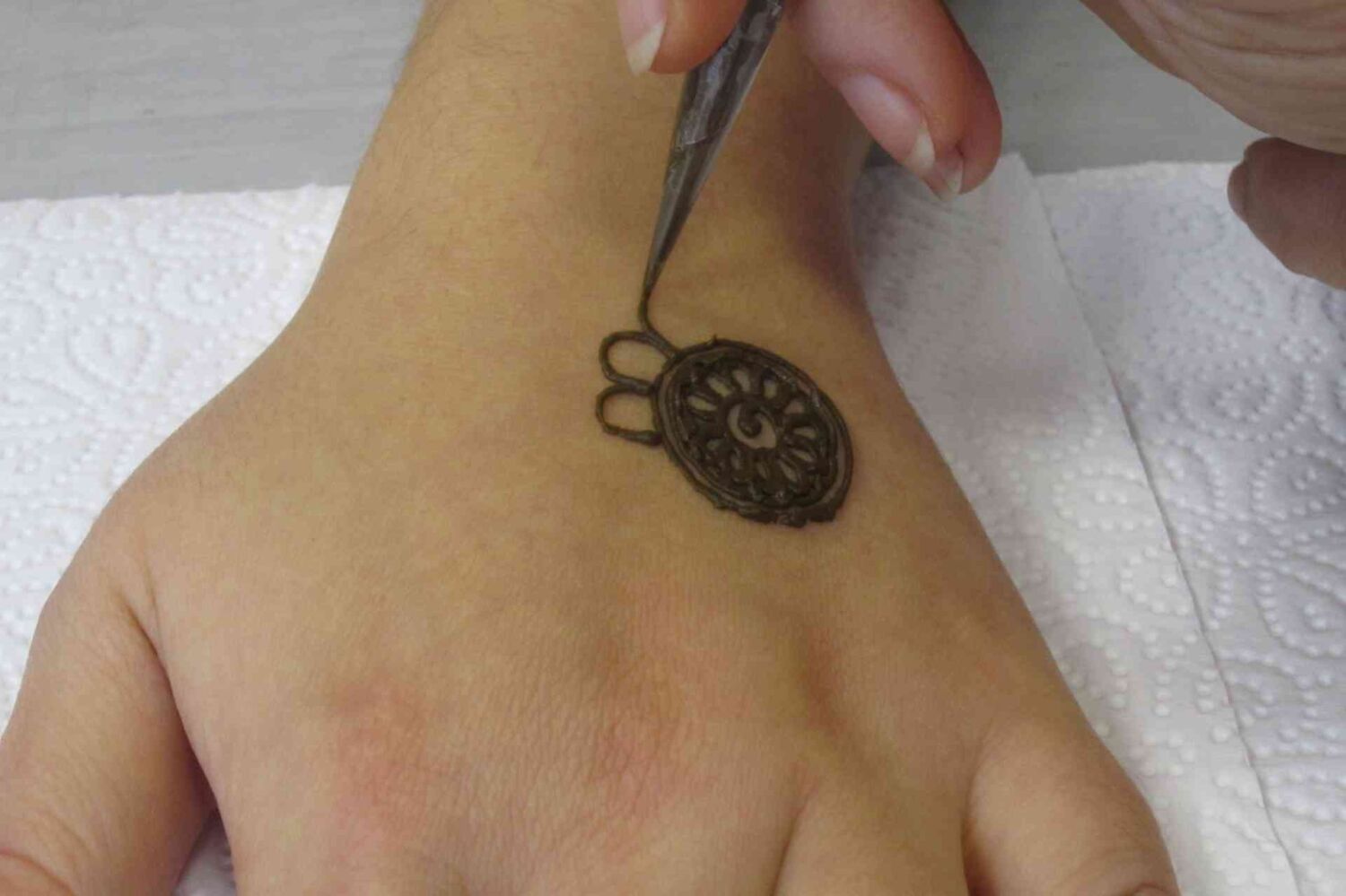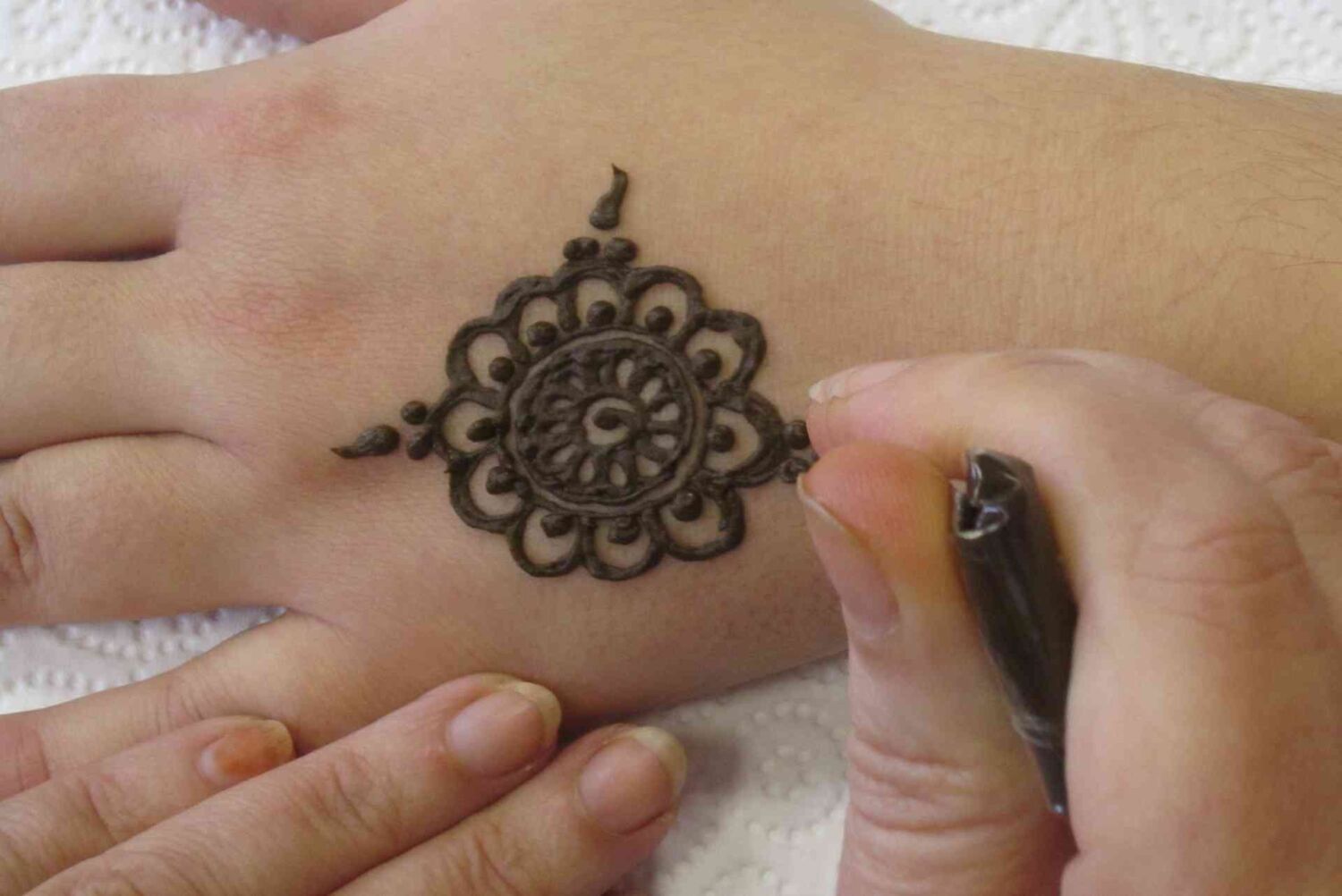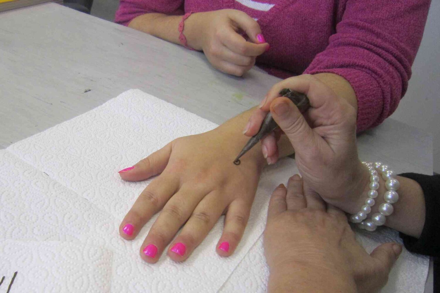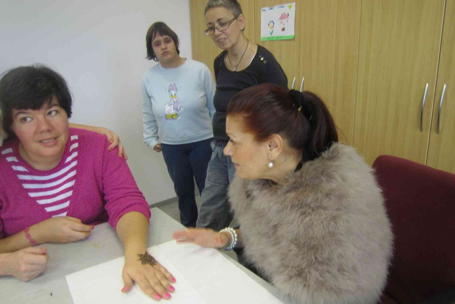 Gospa Sonja kano pripravi na poseben način in jo s stožcem nanaša na kožo. Nismo se mogli načuditi vsem prelepim vzorcem, ki so nastajali pod njenimi spretnimi rokami. Vsak od nas je dobil prav poseben vzorec samo zanj. Ko je bila pasta nanešena na kožo, nam je poslikavo utrdila z mešanico limoninega soka in sladkorja, vse to pa smo morali pustiti nedotaknjeno čim dalj časa, da se je barvilo dobro prijelo. Naslednji dan smo bili vsi obdarovanci zelo lepo in prav posebno okrašeni in pripravljeni na prihajajoče praznične dni.