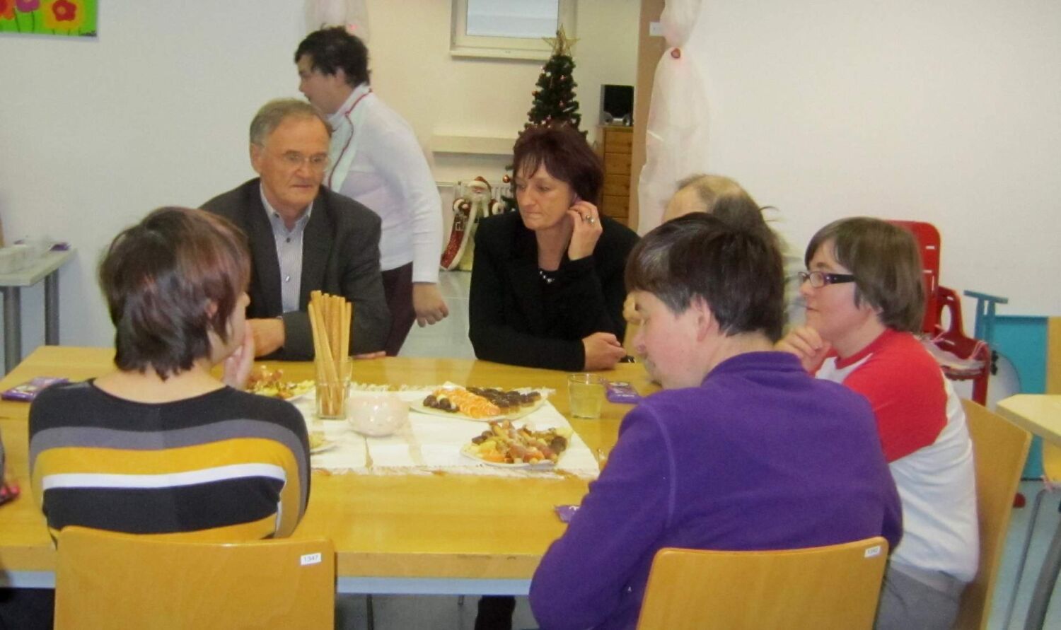 V letošnjem decembrskem času smo z veseljem v naši enoti pozdravili novega župana, g. Cirila Kozjeka. Aleš in Zdenka sta mu ponosno razkazala naše prostore in povsod opisala, kaj vse delamo, kako šivamo voščilnice, sestavljamo zamaške, v sobi za počitek beremo časopis, knjige, tudi počivamo ali pa se igramo namizne igre.