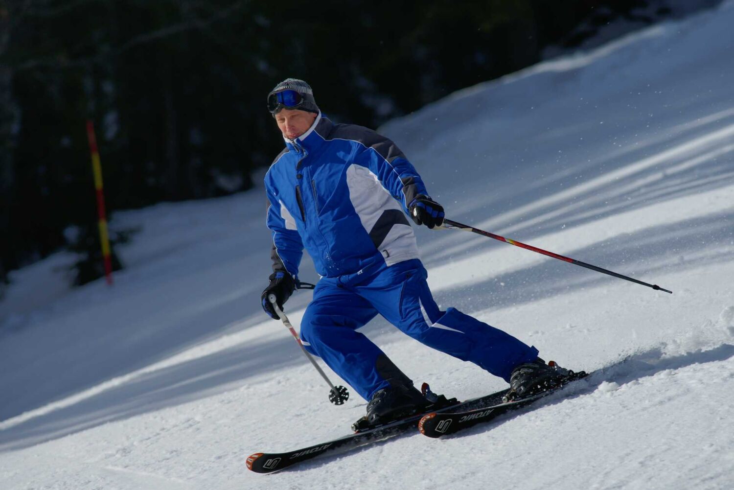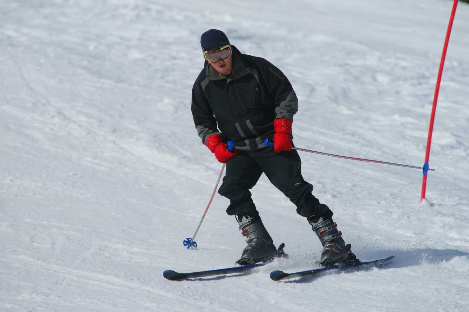 Ekipa alpskih smučarjev je rezala zavoje na veliki beli strmini pri Šport hotelu.