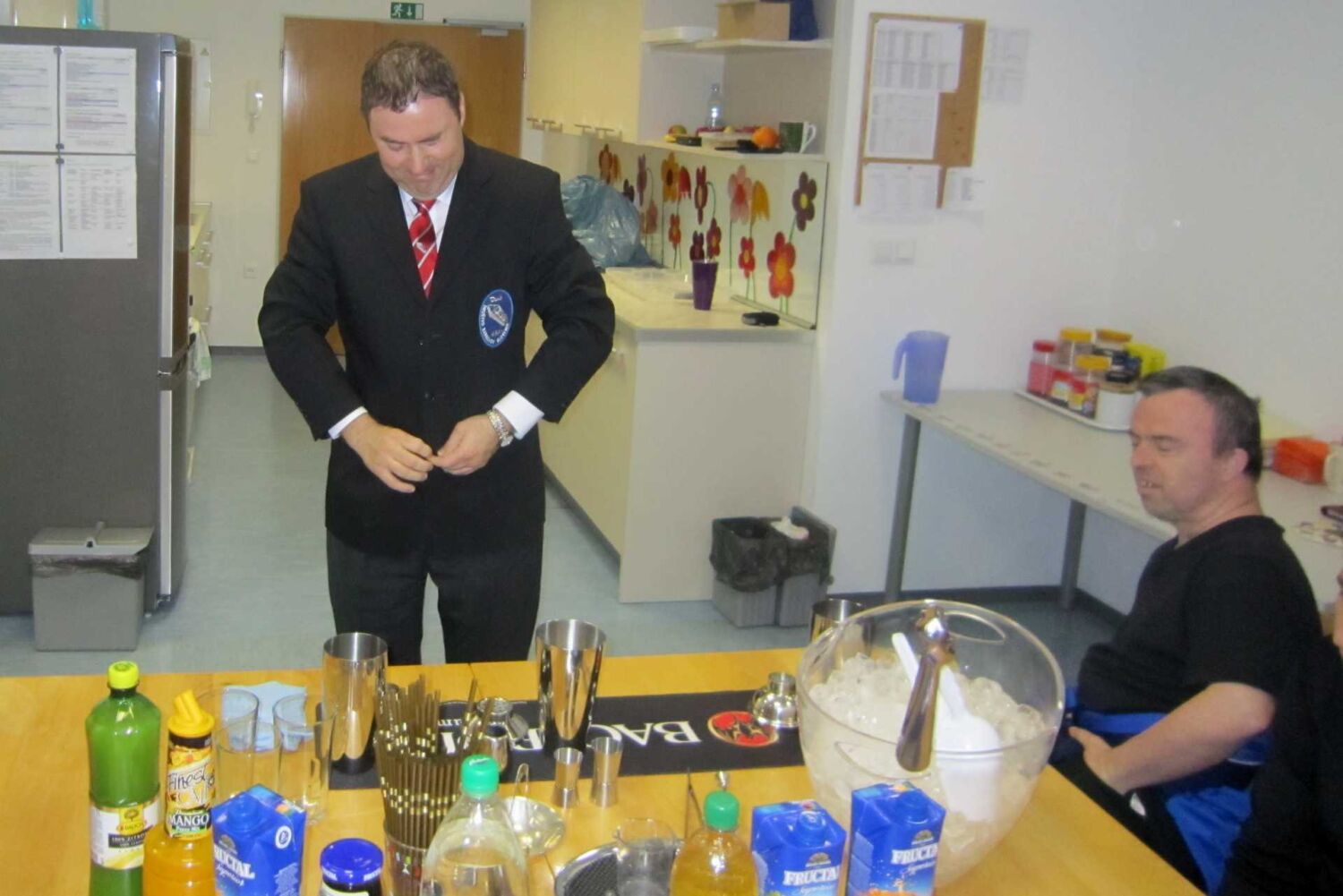 Že veliko let se ukvarja s tem. Vsem nam je prijazno razložil, kakšne pripomočke potrebuje pri mešanju koktajlov. Barmani so tudi lepo oblečeni, imajo kravato, lepo srajco in suknjič.
