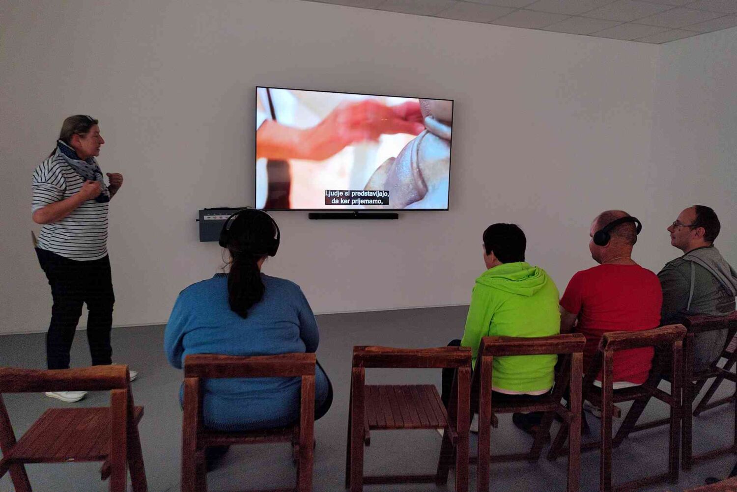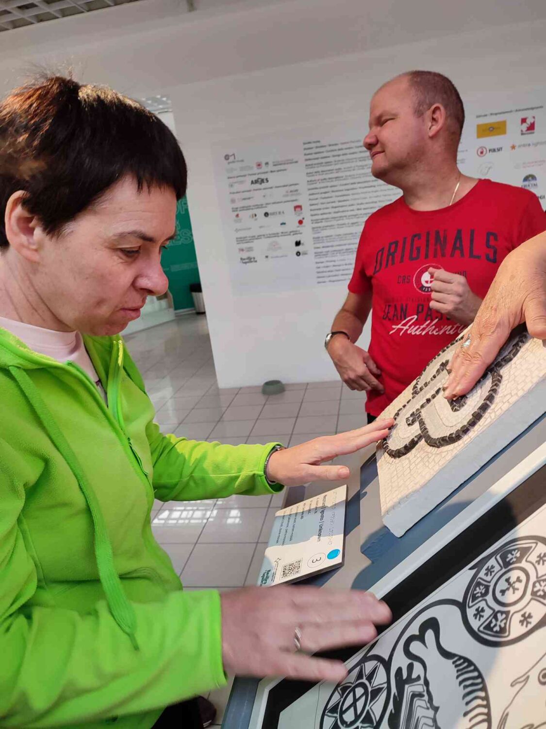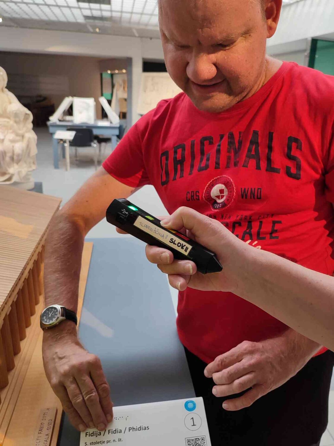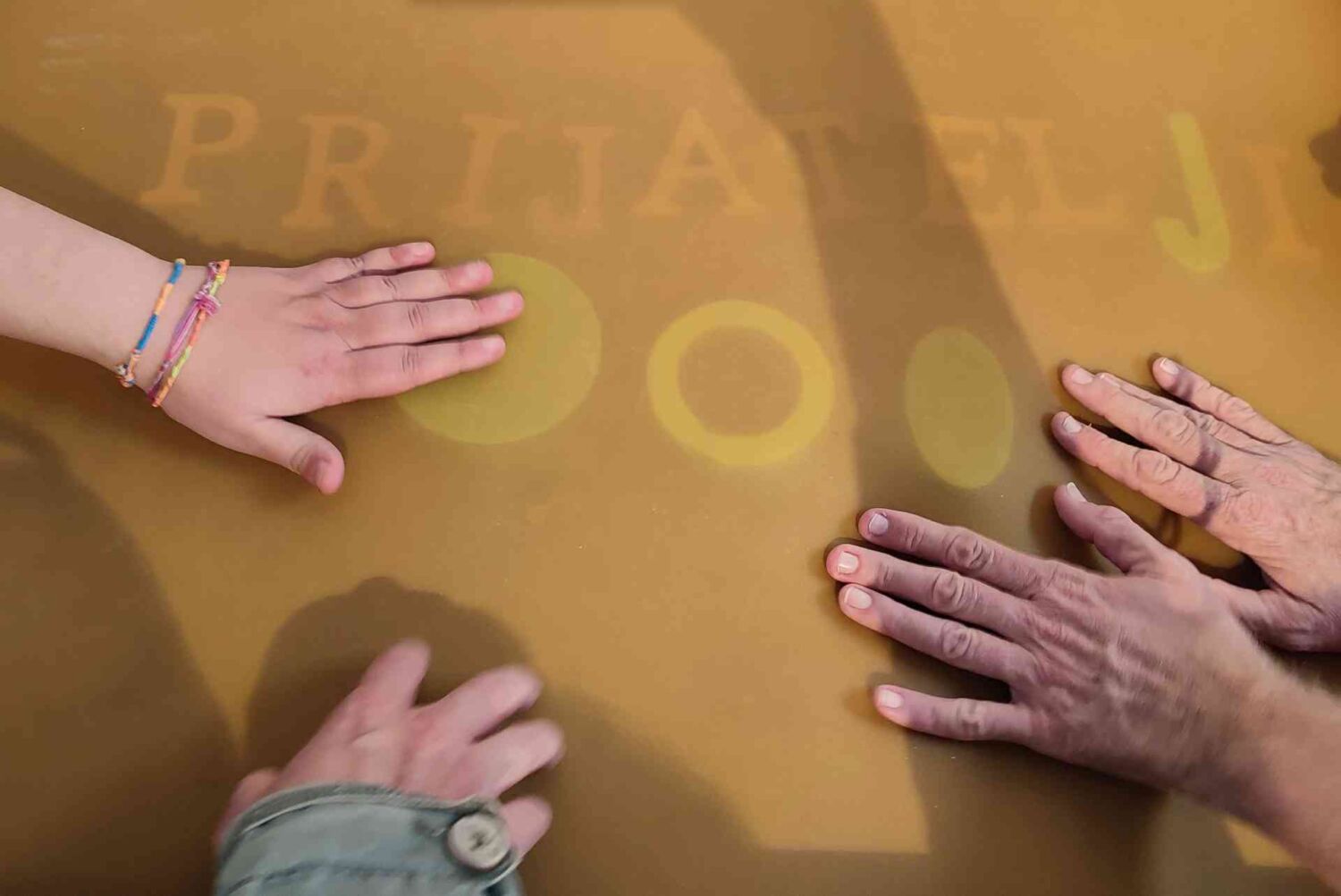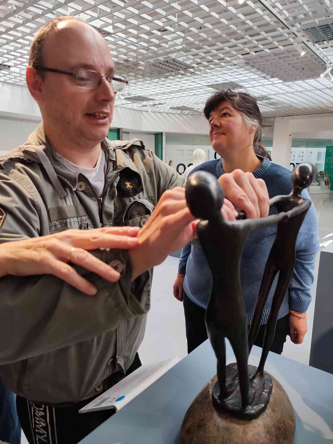 Namesto običajnega opozorila »Ne dotikaj se« nas je vodička prijazno povabila, da umetnost resnično začutimo – z rokami. Obiskovalci smo se dotikali replik umetniških del, ob tem pa poslušali zanimive zgodbe in si ogledali video, ki je prikazal nastanek umetnin, ustvarjenih v sodelovanju umetnikov z osebami s slepoto in slabovidnostjo.