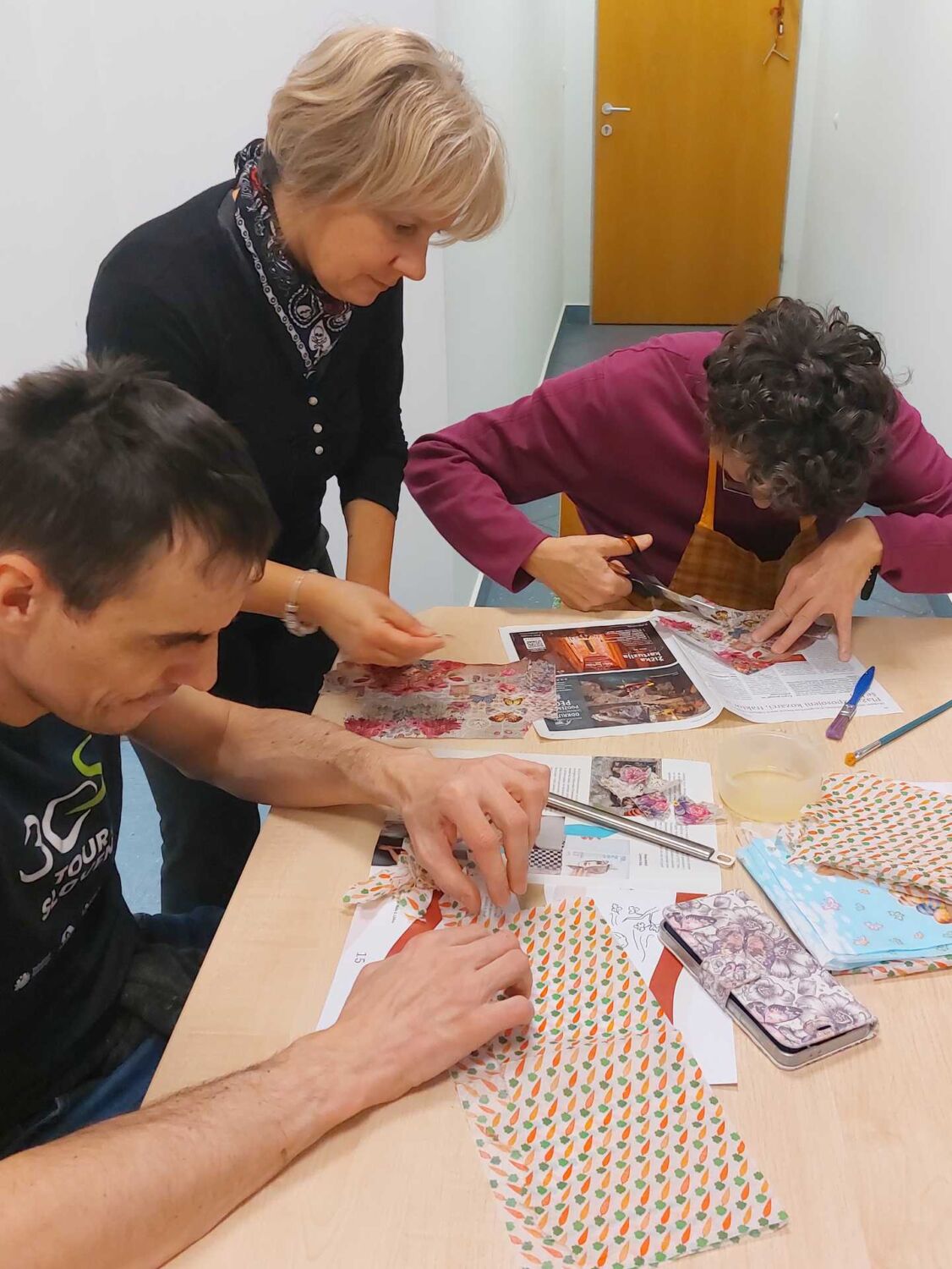 Izpod spretnih rok uporabnikov so nastali tudi čudoviti izdelki iz blaga – piščančki, zajčki in kokoške, ki lepo popestrijo praznični aranžma.